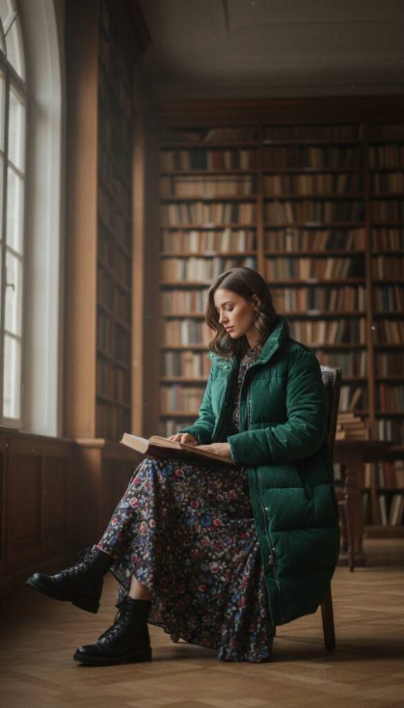 Infuse your wardrobe with the moody elegance of Dark Academia through a luxurious long velvet puffer jacket in a deep, opulent hue like forest green or burgundy. This unexpected texture elevates the casual puffer into a statement piece, perfect for evening wear or sophisticated daytime events. Layer it over a dark floral maxi dress featuring subtle gothic inspired prints, creating a romantic and mysterious silhouette. Complete the look with robust, polished combat boots and an antique inspired pendant necklace, crafting an ensemble that is both intellectually chic and dramatically captivating for the modern woman.