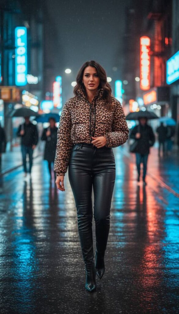 Embrace the audacious glamour of the Mob Wife aesthetic with a statement making cropped puffer. This luxurious piece features a striking leopard print, exuding an air of unapologetic confidence and old world opulence. Pair it with high waisted black leather trousers that hug the figure, creating a sleek bottom half that balances the volume of the jacket. Finish the ensemble with sharp pointed stiletto boots and oversized dark sunglasses, completing a look that is both fiercely fashionable and utterly unforgettable.