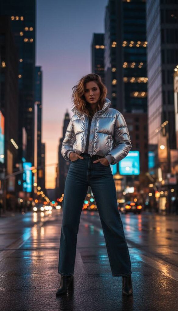 Inject futuristic allure into your winter wardrobe with a captivating metallic silver cropped puffer. This eye catching piece reflects light beautifully, instantly transforming a simple outfit into a fashion forward statement. Pair it with dark wash, high waisted wide leg jeans, offering a contemporary silhouette that perfectly balances the jacket’s bold sheen. Underneath, opt for a minimalist black ribbed knit top to maintain focus on the puffer. Accessorize with sleek, silver toned jewelry and black ankle boots for an ensemble that radiates cool sophistication and modern edge.