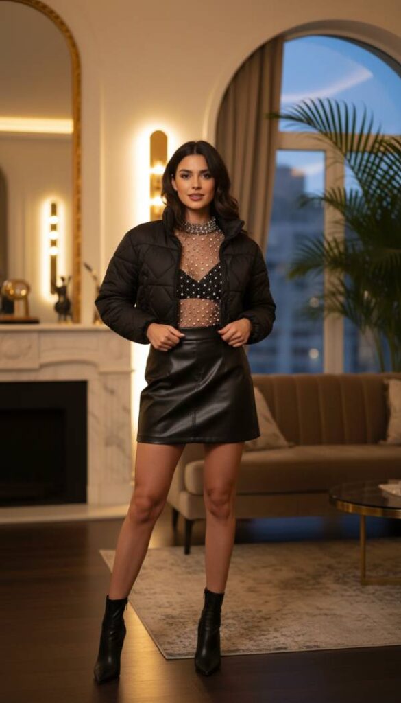 Explore the alluring trend of sheer fabrics with a tastefully layered ensemble centered around a sleek cropped black puffer. This minimalist puffer provides structure and warmth, allowing the delicate layers beneath to shine. Underneath, don a sheer long sleeve top with subtle embellishments, such as delicate lace or intricate embroidery, creating an ethereal and sophisticated effect. Pair this with a high waisted faux leather mini skirt for a touch of edgy glamour. Finish the look with opaque black tights and elegant ankle boots, achieving a harmonious balance between softness, texture, and modern appeal for the fashion forward woman.
