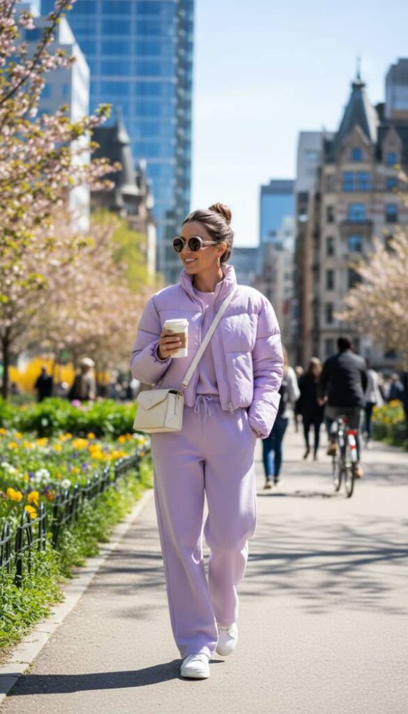Elevate your athleisure game with a sophisticated co ord set that combines comfort with undeniable style. This ensemble features a cropped pastel colored puffer jacket, perhaps in a soft lavender or sky blue, paired with matching wide leg tracksuit bottoms crafted from a premium, silky smooth fabric. The monochromatic pairing creates a cohesive and polished aesthetic, making loungewear feel instantly luxurious. Complete this chic look with pristine white designer trainers and a structured mini shoulder bag, perfect for effortless daytime excursions where comfort and fashion intertwine beautifully.