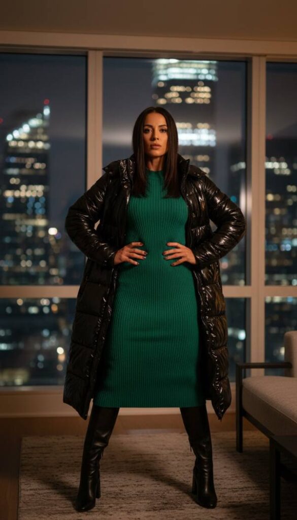 Exude an aura of modern power and edgy sophistication with a long patent vegan leather puffer jacket. The high shine finish of this piece makes a dramatic statement, reflecting light and adding an instant dose of glamour to any outfit. Pair it over a body skimming knit midi dress in a rich jewel tone like emerald or sapphire, creating a sleek and luxurious foundation. Finish the look with knee high leather boots that disappear seamlessly under the dress and minimal silver toned jewelry, resulting in an ensemble that is both fiercely fashionable and impeccably chic, perfect for the confident woman.