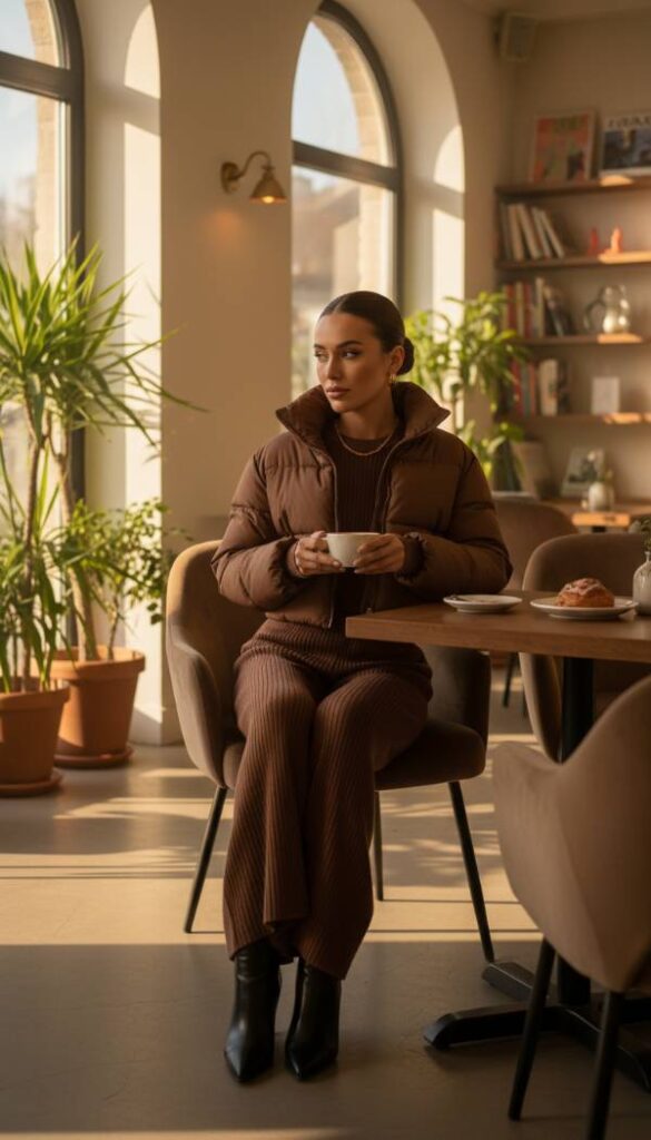 Embrace the timeless appeal of monochromatic dressing with an indulgently rich espresso brown cropped puffer. This deep, warm hue offers a sophisticated alternative to traditional black, creating a luxurious and cohesive aesthetic. Pair the puffer with a matching espresso brown knit set, comprising a cozy oversized sweater and a coordinating wide leg knit pant. This creates an uninterrupted line of color, elongating the silhouette and exuding an air of effortless chic. Complete the ensemble with sleek pointed toe boots and minimal gold jewelry for a look that is both comfortable and exquisitely refined for the discerning woman.