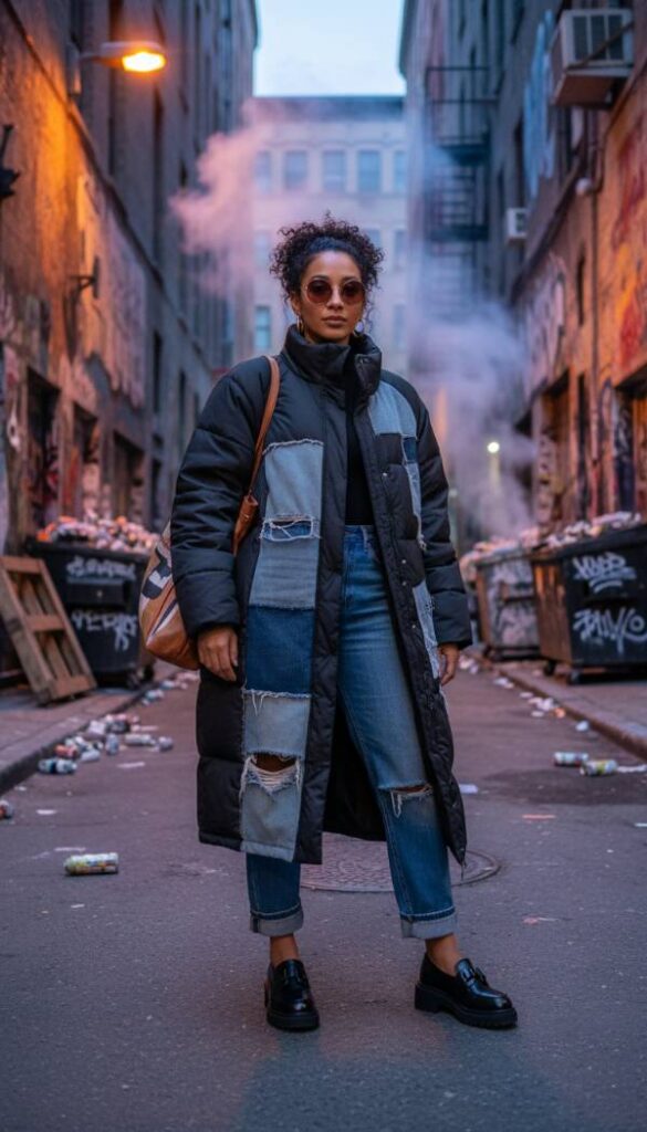 Make a bold, artistic statement with a long puffer jacket featuring intricate deconstructed denim patchwork. This unique piece showcases a blend of different denim washes and textures, creating an avant garde yet effortlessly cool aesthetic. Layer it over a simple white ribbed knit top and pair with distressed straight leg jeans that echo the jacket’s relaxed, edgy vibe. Complete the ensemble with chunky platform loafers or robust combat boots, adding an element of grounded sophistication. This look is perfect for the woman who appreciates individuality and a contemporary, urban inspired edge in her wardrobe choices.