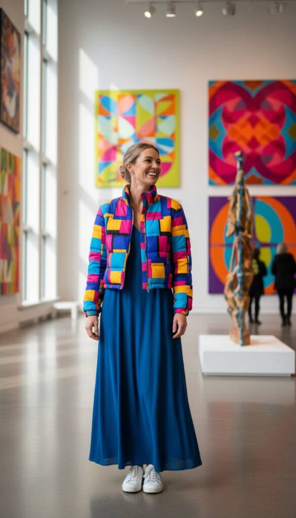 Embrace a playful yet sophisticated aesthetic with a cropped puffer jacket featuring a bold, vibrant pop art inspired geometric print. This eye catching piece serves as the ultimate statement maker, infusing your look with artistic flair and contemporary energy. Balance its striking visual impact by pairing it with a solid colored, minimalist maxi dress in a complementary or neutral shade, allowing the jacket to remain the undisputed focal point. Complete the ensemble with clean lined white sneakers for an urban edge and a simple, geometric shaped handbag, curating an outfit that is both fun and undeniably fashion forward for the modern woman.