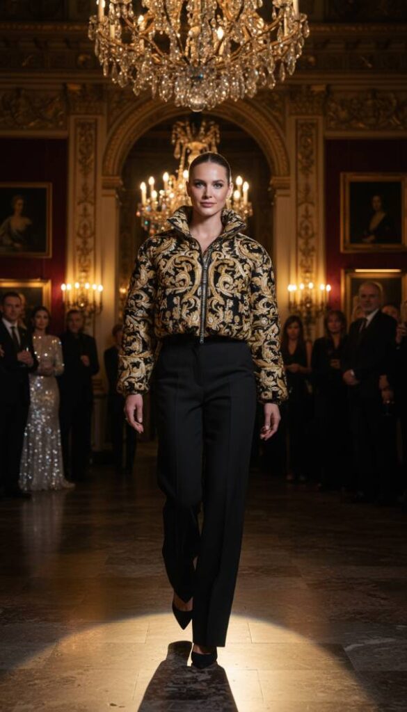 Channel opulent artistry with a cropped puffer jacket featuring exquisite baroque inspired embroidery or a rich jacquard pattern. This highly decorative piece elevates the humble puffer to a work of art, perfect for making a grand entrance. Opt for designs with metallic gold threading or deep jewel tone motifs that evoke historical luxury. Pair this statement jacket with impeccably tailored black wide leg pants, allowing the intricate details of the puffer to truly shine. Finish the ensemble with minimalist stiletto heels and a sleek clutch, creating a sophisticated and dramatically chic look for the woman who appreciates lavish detail.