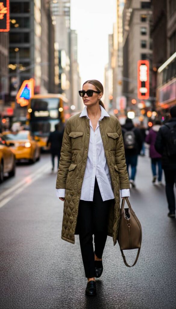 Achieve a perfectly balanced blend of utilitarian function and sharp tailoring with a long khaki utility puffer jacket. This piece, characterized by its practical design elements and durable fabric, gains an instant upgrade when paired with contrasting sophisticated pieces. Layer it over a crisp, oversized white button down shirt that peeks out from beneath, adding a touch of classic polish. Complete the ensemble with slim fit black tailored trousers and sleek black loafers, creating a cohesive and effortlessly chic look that transitions seamlessly from casual outings to smart casual professional settings for the contemporary woman.