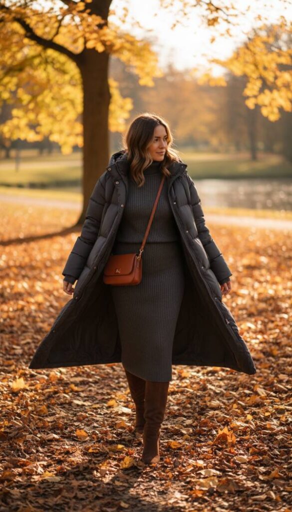Elevate everyday comfort with a luxurious knit skirt set paired with a chic, long line puffer jacket. Choose a puffer in a sophisticated neutral, such as charcoal gray or deep camel, for an effortlessly polished foundation. Underneath, a finely ribbed knit midi skirt and matching long sleeve top create a seamless, figure flattering silhouette that exudes quiet elegance. The combination of the cozy knitwear with the sleek puffer offers both warmth and an elevated texture play. Complete the ensemble with knee high suede boots and a minimalistic leather tote bag, perfecting a look that is both supremely comfortable and undeniably stylish for the contemporary woman.