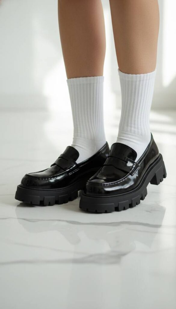 Ground your airy minimalist looks with the substantial weight of a chunky loafer. This shoe style has transitioned from a trend to a staple, offering height and durability without the pain of stilettos. The exaggerated sole adds a modern edge to the classic penny loafer silhouette. Wear them with white ankle socks to tap into the preppy academia vibe or go sockless for a cleaner look. The black leather contrast against lighter clothing creates a visual anchor that balances the outfit. They are practical, stylish, and durable enough to handle city streets with ease.