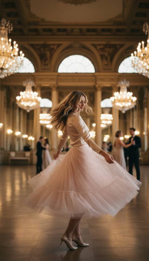 Embrace a sophisticated interpretation of Balletcore with this exquisitely embellished tulle midi skirt, a whimsical yet elegant choice for New Years Eve. Layers of fine tulle create a graceful, ethereal volume, while delicate sequin or pearl embellishments add a subtle sparkle, catching the light with every movement. Its midi length offers a refined silhouette, perfect when paired with a sleek silk camisole or a cashmere knit top. This piece embodies graceful femininity and offers a softer, dreamlike aesthetic that stands apart from typical festive attire, providing a truly unique and enchanting look.