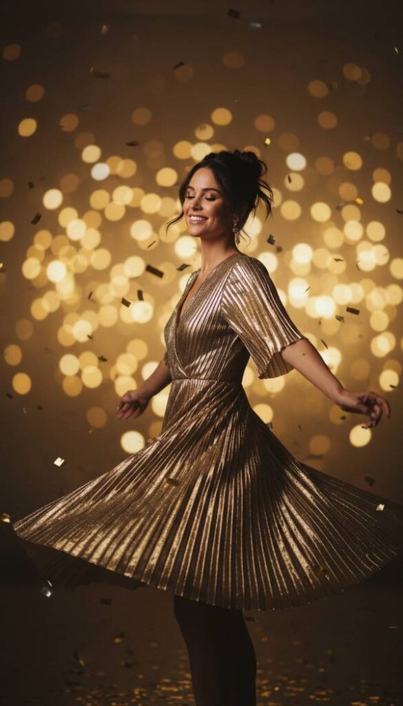 Shine brightly this New Years Eve in a stunning metallic plissé pleated midi dress, offering both structural elegance and captivating movement. The fine, accordion like pleats create a dynamic texture that catches and reflects light beautifully, ensuring a dazzling effect with every step. Its midi length and often relaxed fit provide a comfortable yet incredibly chic silhouette, perfect for dancing the night away. This dress embodies sophisticated festivity, blending modern design with timeless allure, and stands as an artful expression of celebratory style, perfect for making an impressive statement.