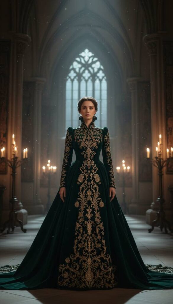 Channel the grandeur of the Baroque era with this magnificent embroidered velvet brocade gown, a truly regal choice for New Years Eve. The luxurious velvet base is adorned with intricate metallic embroidery or woven brocade patterns, creating a tapestry of rich texture and color. Its opulent design and jewel toned hue make a powerful, sophisticated statement, perfect for a formal celebration. This gown is an homage to historical elegance, reinterpreted for the modern discerning woman, ensuring you embody timeless luxury and dramatic flair. Its substantial fabric offers a beautiful drape and an undeniably luxurious feel.