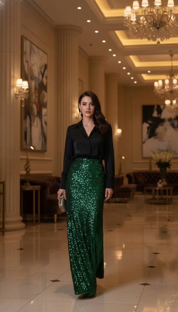 Infuse your New Years Eve look with the captivating depth of jewel tones by choosing this stunning emerald green sequin maxi skirt. The rich, verdant hue combined with all over shimmering sequins creates a mesmerizing play of light and color, ensuring you sparkle with sophisticated elegance. Its maxi length offers a graceful, flowing silhouette, perfect when paired with a sleek black top or a delicate lace camisole. This skirt is a luxurious and vibrant alternative to traditional dresses, allowing for versatile styling while still making an undeniable festive impact with its rich, opulent color.