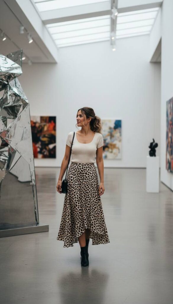 Embrace contemporary elegance with an asymmetrical cheetah print maxi skirt, featuring a dynamic hemline that adds intriguing movement and modern flair. This sophisticated piece pairs beautifully with a finely ribbed, form fitting knit top in a complementary neutral shade, creating a balanced and polished ensemble. The flowing silhouette of the skirt offers both comfort and a dramatic visual appeal, ideal for an art gallery opening or a chic dinner party. This look is about subtle sophistication and an appreciation for innovative design, allowing the unique cut of the skirt to be the focal point of your refined style story.
