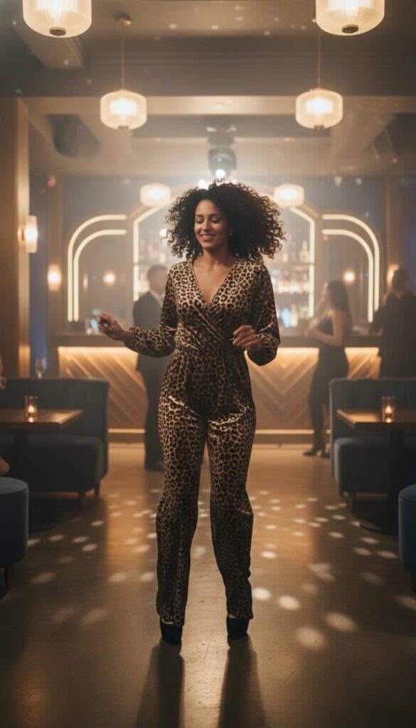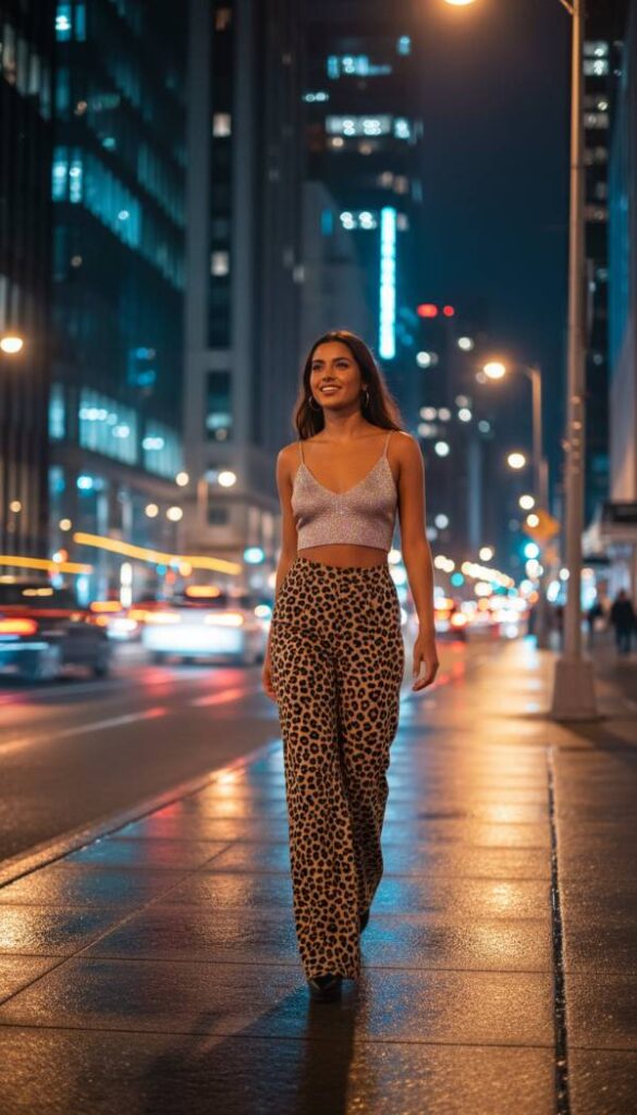 Combine comfort with undeniable glamour by opting for fluid, wide leg cheetah print trousers paired with a dazzling sparkle knit crop top. This ensemble offers a modern take on 70s inspired disco chic, providing effortless movement and captivating shimmer. The generous cut of the trousers ensures comfort throughout your evening, while the sparkling top adds a festive, party ready touch. Ideal for a night of dancing or a lively social gathering, this look is about embracing joyful fashion and making a statement with ease. It is a celebration of confident style and comfortable sophistication.