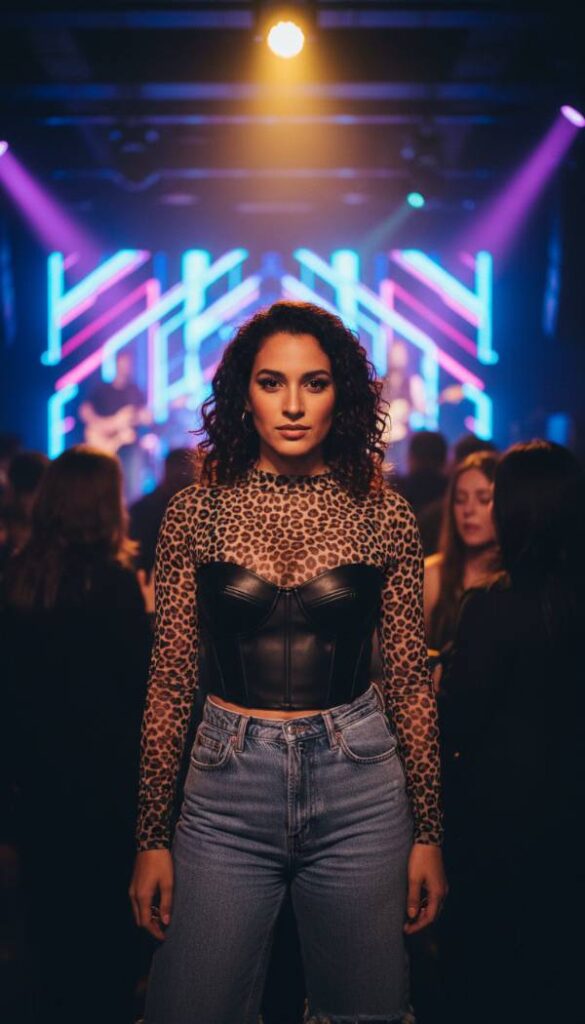Embrace an edgy, contemporary aesthetic with a sheer cheetah print mesh long sleeve top, artfully layered over a sleek bustier. This modern combination offers a captivating play on transparency and structure. Paired with high waisted, dark wash denim jeans, it creates a look that is both alluringly bold and effortlessly cool. Ideal for a night out at a trendy music venue or a vibrant social gathering, this ensemble is about sophisticated layering and unexpected pairings. It is a testament to the modern woman who expertly blends high fashion with an approachable, confident edge.