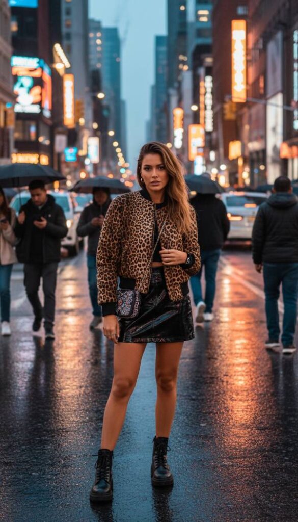 Infuse your night out look with an effortlessly cool, sporty luxe vibe by pairing a statement cheetah print bomber jacket with a sleek leather mini skirt. This unexpected combination merges urban edge with high fashion sophistication, creating an ensemble that is both comfortable and strikingly chic. The relaxed fit of the bomber contrasts beautifully with the sharp lines of the leather skirt, offering a balanced silhouette. Perfect for a casual yet elevated evening with friends or exploring the city’, this look speaks to a confident, fashion forward sensibility that values both style and ease.