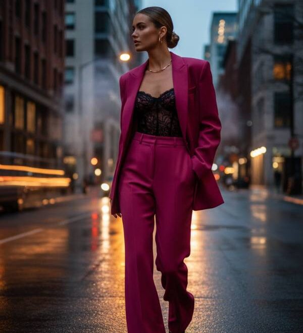 Embrace the commanding presence of the Office Siren aesthetic with a perfectly tailored fuchsia pink blazer. This bold piece features a sharp, structured silhouette and is paired with matching wide leg trousers, creating an unbroken line of sophisticated power. Underneath, a delicate black lace bustier offers a subtle hint of allure, balancing the suit’s formidable structure. The ensemble speaks to a woman who is both confident in her professional prowess and unafraid to express her refined sense of personal style. Accessorize with sleek, minimalist jewelry and pointed toe heels for an immaculate finish, commanding attention in every room.