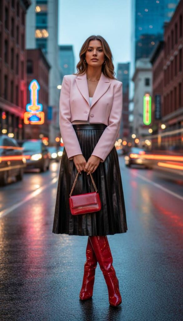 Infuse your pink blazer ensemble with a captivating dash of current trend through strategic color contrast. A pastel pink cropped blazer provides a youthful yet sophisticated top layer, perfectly complementing a high waisted black leather midi skirt that offers sleek texture and structure. The true viral moment arrives with a pair of striking cherry red patent leather knee high boots, instantly elevating the outfit with an unexpected pop of vibrant color. A matching micro handbag echoes the bold footwear choice, creating a cohesive and fashion forward statement that is both playful and polished for any discerning event.