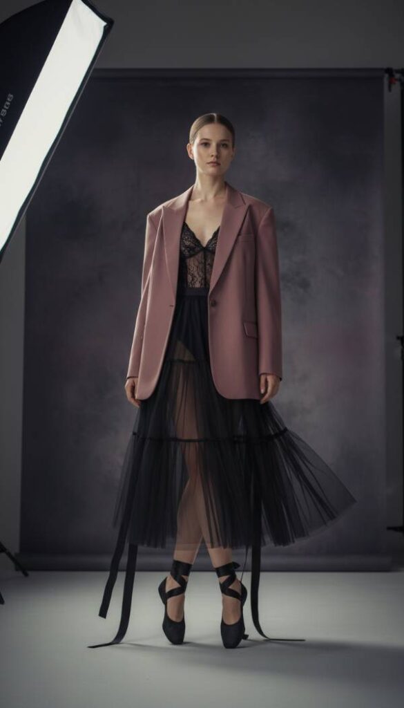 Reimagine the delicate aesthetic of balletcore with a touch of sophisticated darkness. A dusty pink oversized blazer serves as the centerpiece, its soft hue beautifully contrasting with the ethereal volume of a sheer black tulle maxi skirt underneath. This pairing evokes a sense of romantic drama and movement. A delicate black lace bodysuit peeks through, adding intricate texture and an element of refined sensuality. The look is grounded with elegant pointed toe ballet flats, their ribbons gracefully tied around the ankles, creating an elevated and enchanting silhouette that is both dreamy and chic.