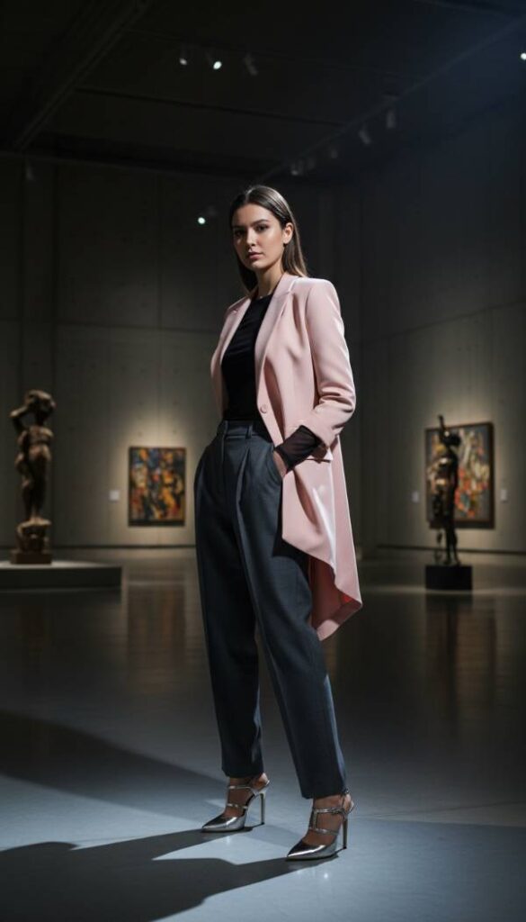 Embrace the avant garde with a deconstructed pink blazer, showcasing an intentional asymmetric hemline that defies traditional tailoring. This conceptual piece is layered over a sheer black long sleeve top, providing a subtle textural contrast and a hint of modern transparency. Tailored charcoal grey pleated trousers ground the look, offering a sophisticated counterpoint to the blazer’s unconventional design. The ensemble is completed with architectural high heels, further emphasizing the outfit’s artistic and cutting edge appeal. This curated look is for the woman who appreciates innovative design and refined fashion expression.
