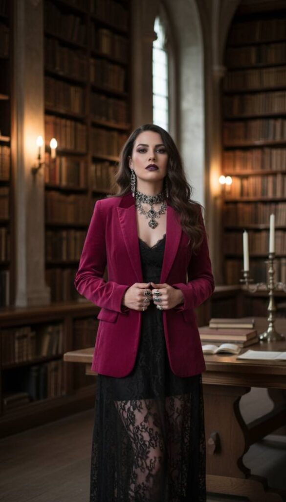 Indulge in a rich textural narrative with a deep fuchsia pink velvet blazer, offering a luxurious and opulent feel. This statement piece is styled over a black sheer lace maxi dress, creating a captivating interplay between solid structure and delicate transparency. The deep, romantic hues are further enhanced by dark plum lipstick, adding a touch of sophisticated drama and a nod to a modern gothic sensibility. Ornate silver jewelry, perhaps an antique inspired necklace or ring, provides a final flourish of old world charm, completing an ensemble that is both sensuous and profoundly elegant.