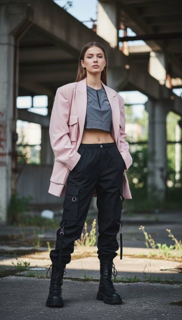 Explore an unexpected sartorial fusion by injecting gorpcore elements into your pink blazer ensemble. This avant garde look features an oversized pastel pink utility blazer, distinguished by its multiple functional pockets and durable fabrication. It creates a striking contrast when paired with black cargo trousers, detailed with bungee cords for an authentic outdoorsy appeal. Chunky platform boots add an urban edge and considerable height, while a technical fabric crop top visible underneath ties into the utilitarian theme. This daring combination redefines casual chic with a high fashion twist.