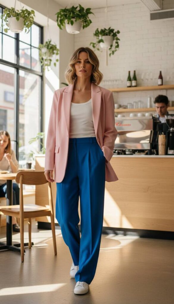 Embrace the energy of contemporary color blocking with a soft pink oversized boyfriend blazer, offering a relaxed yet inherently chic foundation. This gentle hue forms a striking partnership with vibrant ultramarine blue tailored wide leg trousers, creating an invigorating contrast that is both bold and sophisticated. A simple white ribbed tank top underneath provides a clean, minimalist layer, allowing the impactful color combination to take center stage. The ensemble is grounded with clean white minimalist sneakers, cementing its status as a fresh, modern, and effortlessly stylish urban look.