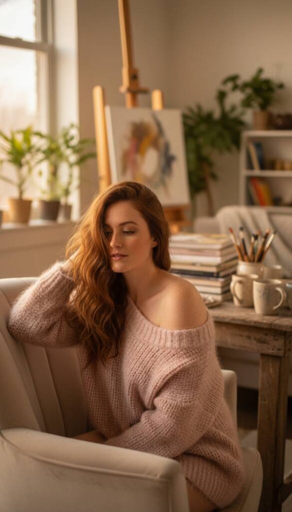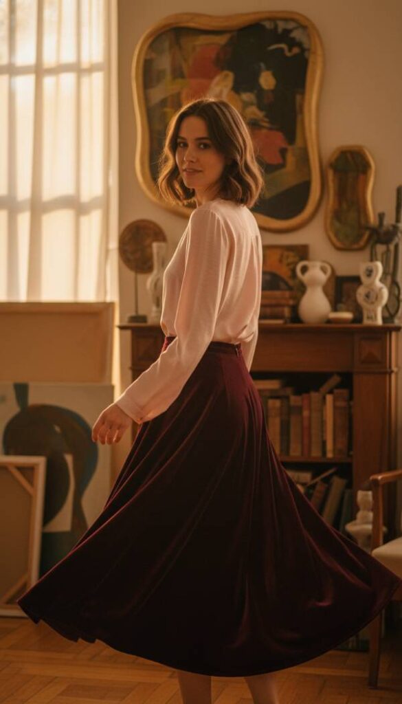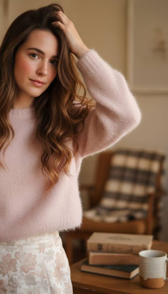 Complement your pink sweater with the opulent touch of a velvet midi skirt in a deep burgundy or rich plum. The fabric’s plush pile absorbs and reflects light with a mesmerizing shimmer, creating a dynamic visual texture that feels incredibly luxurious. Its midi length offers a sophisticated, elongating silhouette, swaying gently with every step. The softness of the velvet feels indulgent against the skin, providing a sense of grandeur without compromising comfort. This skirt adds a foundational richness and depth to the lighter pink tones of your sweater, creating an ensemble that is both balanced and captivating.