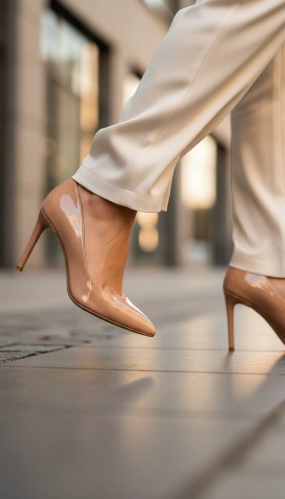 Elevate your pink sweater ensemble with the exquisite polish of nude patent leather stilettos. The glossy finish of the patent leather reflects light brilliantly, adding an instant touch of high fashion glamour to your look. The universally flattering nude shade elongates the leg, creating a seamless and sophisticated line from hemline to toe. Despite their striking appearance, many modern designs prioritize comfort, allowing for confident strides throughout your evening. These shoes are the epitome of chic sophistication, offering a refined contrast to the soft knit, ensuring your outfit is impeccably coordinated and utterly captivating.