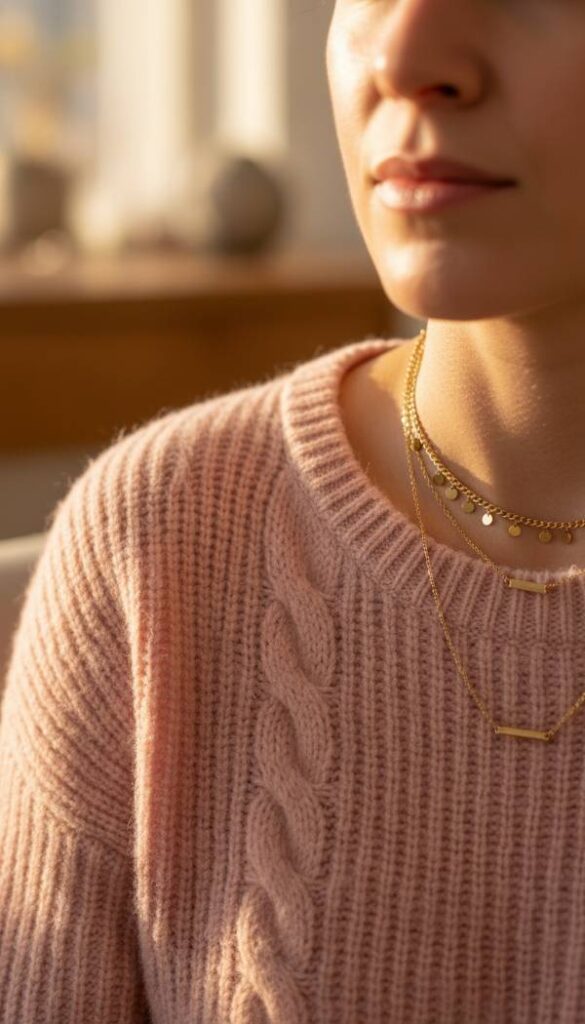 Adorn your décolletage with the subtle gleam of a delicate gold layered necklace, a perfect complement to a pink sweater. The fine chains, often featuring tiny charms or minimalist pendants, catch the light with an understated sparkle, drawing attention to your neckline without overpowering the softness of the knit. The warmth of the gold tones beautifully with various shades of pink, adding a touch of refined luxury. These necklaces feel featherlight against the skin, yet their presence elevates the entire outfit, whispering sophistication. It’s a chic detail that speaks volumes of curated elegance and personal style.