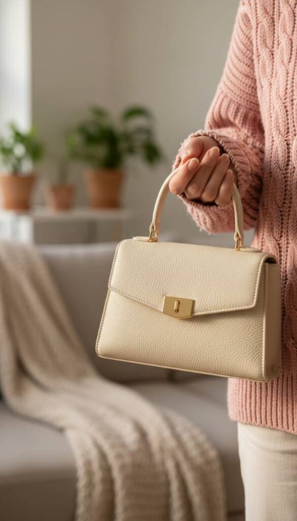 Complete your date night ensemble with a structured mini handbag in a crisp cream or pristine white. Its clean lines and compact silhouette offer a sophisticated contrast to the softer textures of a pink sweater. The polished surface, whether smooth leather or subtle grain, reflects light with a subtle sheen, adding a touch of modern elegance. This small but impactful accessory is perfectly sized to hold essentials, maintaining an uncluttered aesthetic. The bright, fresh hue provides a beautiful visual pop against various pink shades, ensuring your outfit feels cohesive, thoughtful, and utterly chic.