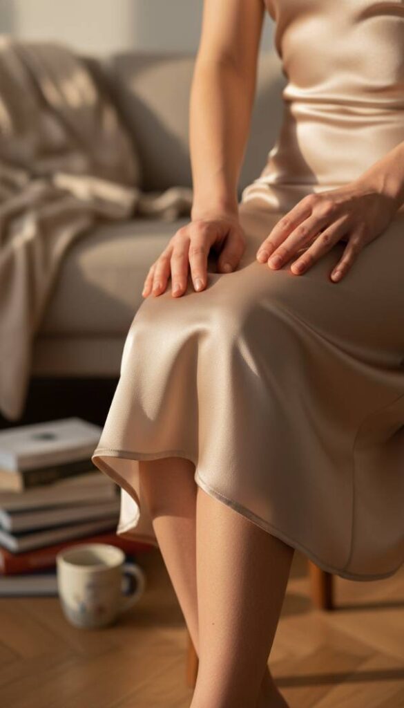 Elevate your pink sweater ensemble with the fluid elegance of a satin slip skirt in shimmering silver or warm champagne. The fabric glides like liquid, its lustrous surface catching and refracting light with every movement, creating a captivating play of highlights. Its minimalist design speaks volumes in sophisticated simplicity, offering a sleek contrast to the soft textures of a knit sweater. The cool, smooth feel against the skin is utterly luxurious. This skirt provides an effortless blend of comfort and glamour, perfectly suited for an evening that calls for refined elegance and a touch of modern allure.