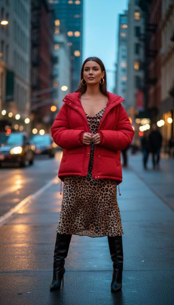 Embrace unapologetic opulence with a longline red puffer styled open over a bias cut silk leopard print slip dress, a nod to the prevailing Mob Wife aesthetic. Pair this powerful visual with knee high leather boots, oversized dark sunglasses, and layers of substantial gold chain necklaces. This look exudes an aura of confident allure and unapologetic luxury, perfect for making a grand entrance. The interplay of the puffer’s sporty volume with the dress’s fluid drape creates a compelling contrast. A patent leather mini bag completes this daringly chic ensemble, embracing a maximalist approach to winter styling.