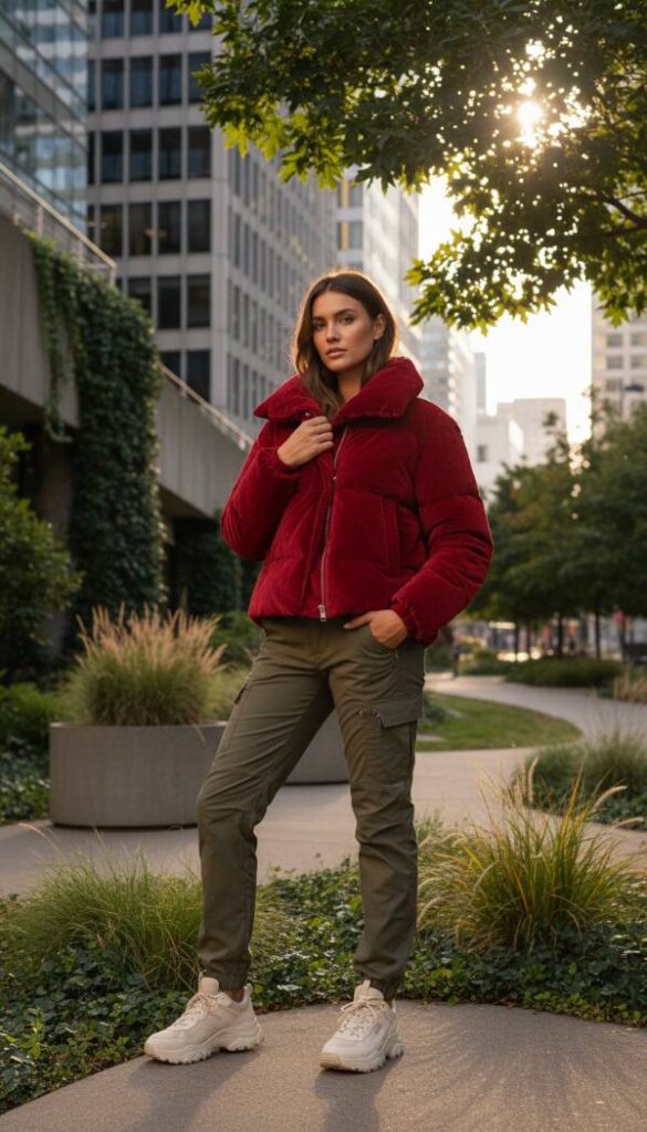 Embrace the elevated gorpcore aesthetic by pairing a vibrant red puffer with technical fabric cargo pants in an earthy tone. Complete this functional yet stylish outfit with chunky trail sneakers and a miniature crossbody bag designed for performance. The juxtaposition of the puffer’s bold color against the utilitarian elements creates a dynamic and modern outdoor inspired look. This ensemble is ideal for urban explorers and those who appreciate practical clothing infused with high fashion appeal. It champions comfort and readiness without sacrificing an ounce of contemporary cool, reflecting a growing appreciation for durable, versatile wardrobe pieces that stand out.