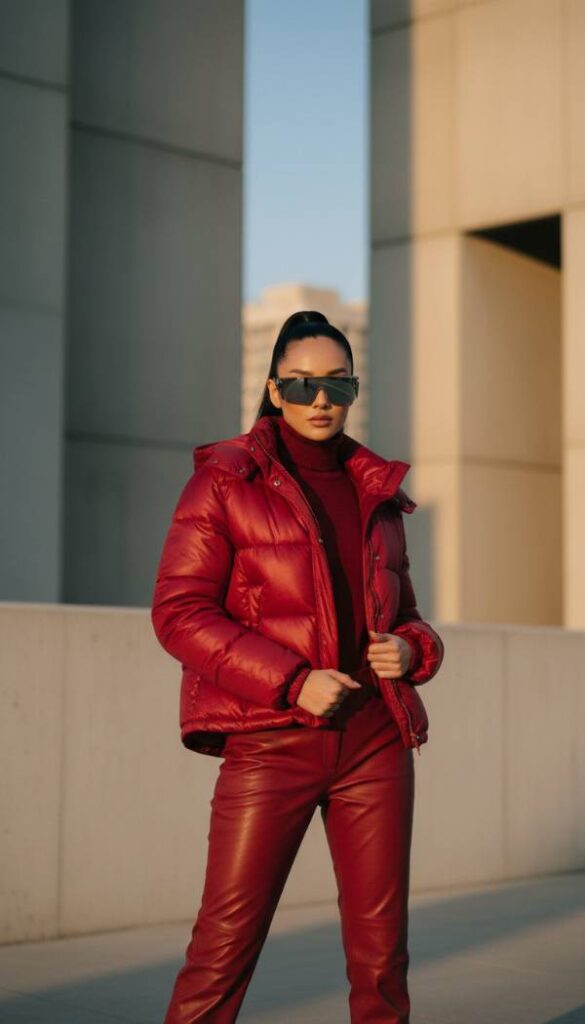 Dive deep into the power of cherry red with a sophisticated monochromatic outfit. Pair your red puffer jacket with high waisted, straight leg leather trousers in an identical or slightly darker shade of red. Layer a fine gauge merino wool turtleneck sweater in a complementary red tone beneath the puffer. Finish the look with sleek ankle boots and a minimalist bag, allowing the rich color and varied textures to speak volumes. This ensemble is a masterclass in elegant simplicity, showcasing a bold color choice with understated confidence. It is a high impact statement without being overly flashy, truly embodying modern luxury.