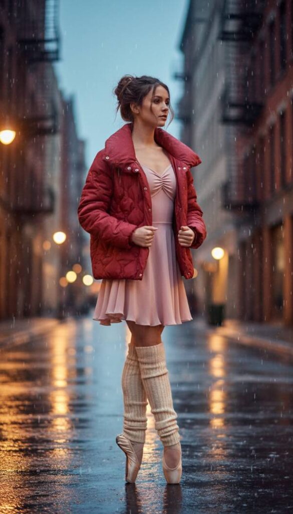 Explore the unexpected beauty of balletcore with a fiery twist. Drape a vivid red puffer jacket over a flowing, knee length satin ballet dress in a muted pastel shade like blush pink or soft lavender. Accessorize with ribbed knit leg warmers worn over delicate ballet flats or kitten heel mules, adding a touch of nostalgic charm. This combination creates a compelling interplay between the puffer’s structured volume and the dress’s ethereal lightness, embodying a playful yet sophisticated femininity. It is a testament to the versatility of the red puffer, capable of softening its bold presence within a graceful, romantic aesthetic.