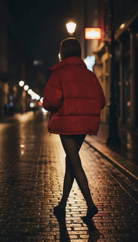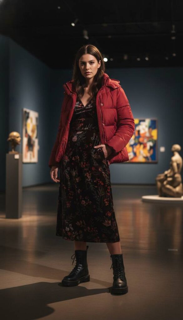 Infuse a touch of romantic gothic allure by styling the red puffer with a darkly elegant floral velvet midi dress. Look for designs featuring deep jewel tones or rich botanical prints on a black or deep navy base. Ground the outfit with chunky combat boots or velvet ankle boots to maintain an edgy sophistication. The puffer’s contemporary, bold presence creates an intriguing contrast with the dress’s vintage inspired texture and pattern, creating a truly unique fashion statement. This look is perfect for cultural events or evening gatherings where you wish to combine warmth with artistic expression and a distinctive, opulent charm.
