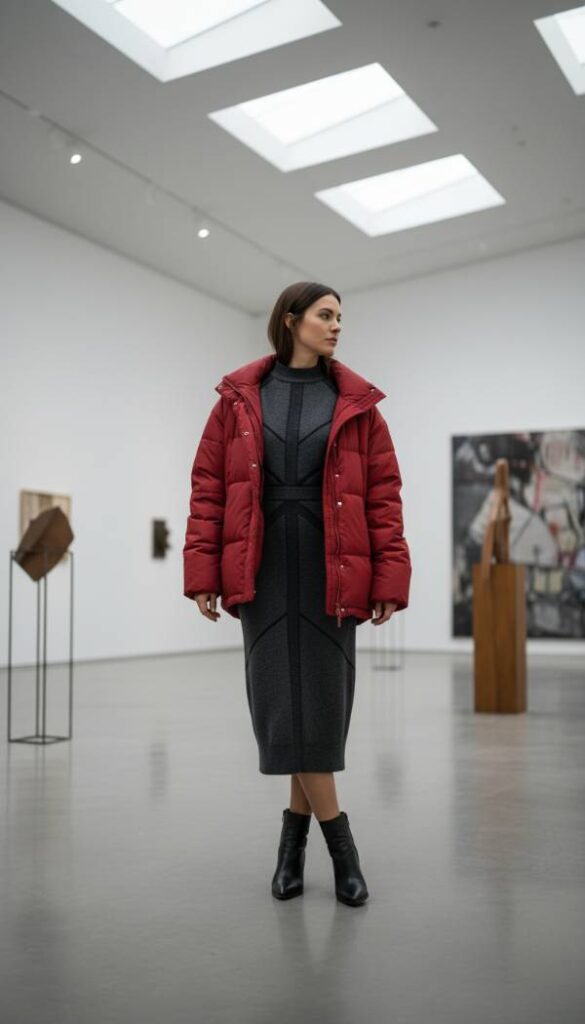 Combine the soft voluminous puffer with a sleek, architectural knit dress for an intriguing play on forms. Opt for a midi or maxi length dress with unique cutouts, asymmetrical hems, or distinct ribbing that creates a sculpted effect. Keep accessories minimal to allow the strong lines of the dress and the vibrant color of the puffer to take center stage. Pair with contemporary ankle boots or elegant pointed toe heels. This look is about modern art meeting wearable fashion, celebrating innovative design and sophisticated textural contrasts. It embodies a refined aesthetic that prioritizes interesting shapes and an elevated sense of style.