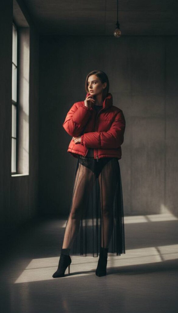 Embrace sophisticated transparency by layering your red puffer jacket over a sheer maxi dress, allowing a chic bralette and high waisted shorts or a sleek slip to be subtly visible underneath. Add another layer, perhaps a fine knit long sleeve top or a thin turtleneck for added texture and warmth. Choose a dress in a dark, ethereal fabric like black tulle or organza. Complete the artistic ensemble with delicate strappy heels or elegant pointed toe boots. This look is a masterclass in controlled exposure and luxurious layering, creating an intriguing, multi dimensional outfit that is both daring and incredibly chic, perfect for a high fashion event.