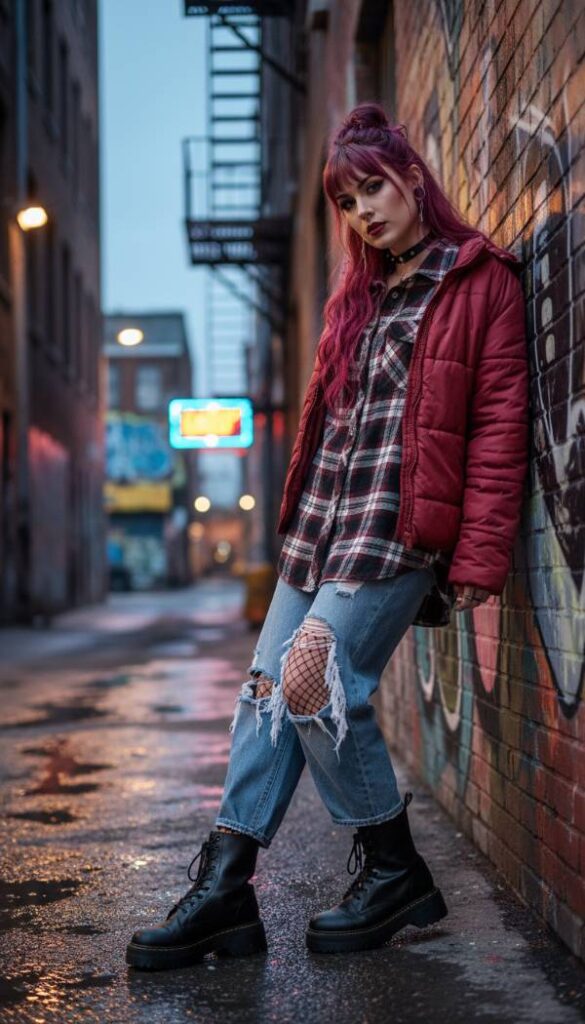 Revisit grunge with a sophisticated, contemporary edge. Layer your red puffer jacket over an oversized, deconstructed flannel plaid shirt in muted earth tones or dark jewel shades, perhaps worn open over a simple black slip top. Pair with artfully torn, wide leg jeans that pool slightly over chunky platform boots. Accessorize with a beanie and a layered silver necklace. This look cleverly blends rebellious spirit with high fashion sensibilities, creating an outfit that feels both nostalgic and utterly current. The red puffer provides a striking, modern focal point, elevating the entire ensemble beyond mere casual wear into a curated street style statement.