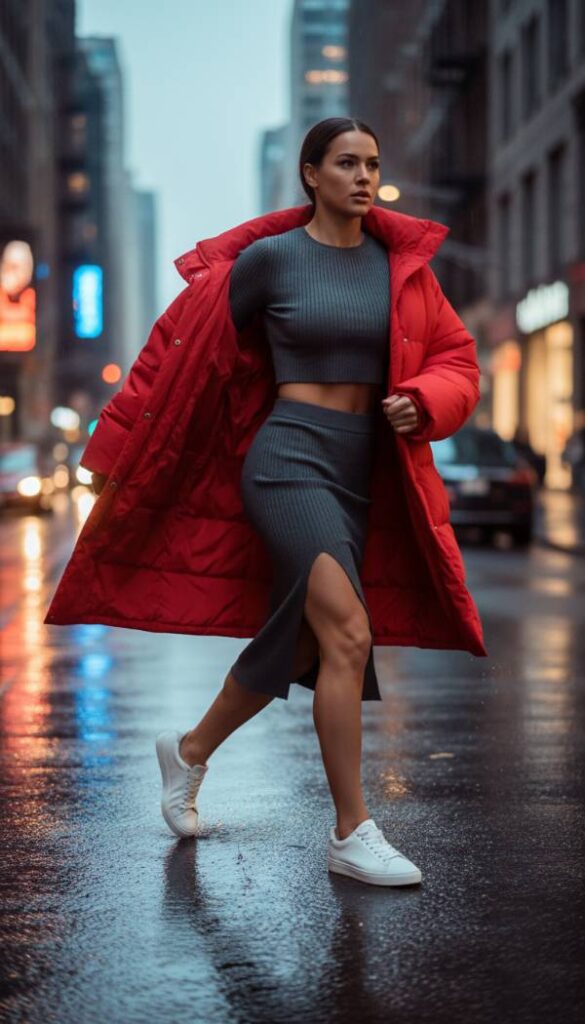 Embrace the evolution of athleisure by pairing your red puffer jacket with a coordinated knit skirt and top set. Opt for a midi length skirt with a subtle slit and a matching long sleeve cropped top in a muted tone such as charcoal, olive, or deep beige. Finish the look with sophisticated white low top sneakers or chunky platform loafers. This ensemble effortlessly bridges the gap between comfort and high fashion, offering a sleek and contemporary silhouette. The vibrant red puffer provides an exhilarating color contrast and a sense of dynamic movement, making it ideal for a stylish yet practical urban outing where ease meets undeniable flair.