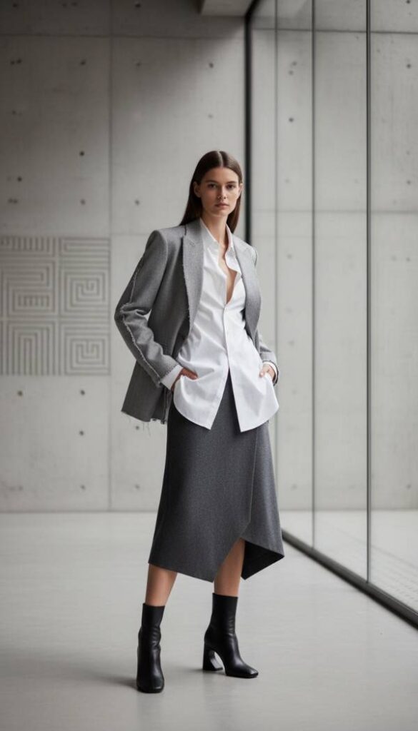 Experiment with modern forms through a deconstructed tailoring ensemble. Begin with an asymmetric midi skirt in a charcoal grey wool, featuring an artful wrap design or a raw edge hemline. Combine this with a crisp white button down shirt, partially untucked, offering a relaxed yet refined aesthetic. Over the shirt, layer a deconstructed blazer, perhaps with cut out details on the lapel or an unconventional closure, in a complementary light grey. The ideal footwear is a modern short boot with a sculptural heel or an architectural silhouette, crafted from black smooth leather, providing an artistic edge. Accessorize with minimalist silver earrings.