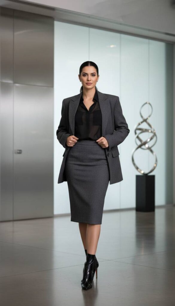 Channel the sophisticated allure of the office siren with a meticulously tailored charcoal grey wool blend pencil skirt, featuring a subtle side slit for elegant movement. Pair it with a sheer black silk blouse, tastefully layered over a delicate bralette or camisole, offering a glimpse of refined femininity. An oversized, single breasted blazer in a matching charcoal hue, draped casually over the shoulders, adds an element of power dressing. Ground this ensemble with a sleek, minimalist short boot, perhaps a stiletto heeled pointed toe design in patent black leather, its shaft extending just above the ankle. A slim silver chain necklace and a structured tote bag complete this polished aesthetic.