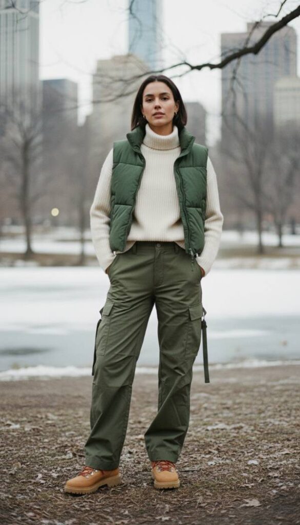 Redefine utility with an elevated gorpcore inspired ensemble. Begin with wide leg cargo trousers in a luxurious olive green technical fabric, offering both comfort and an understated cool factor. Layer a finely ribbed cashmere turtleneck in an ecru shade for warmth and softness, creating a pleasing textural contrast. An insulated, cropped puffer vest in a deep forest green, featuring subtle quilting, adds a functional yet stylish outer layer. The cornerstone footwear is a robust, waterproof short hiking boot with subtle lug soles and metallic hardware accents, perhaps in a rich tan or deep brown leather. Finish with a beanie and a cross body utility bag.