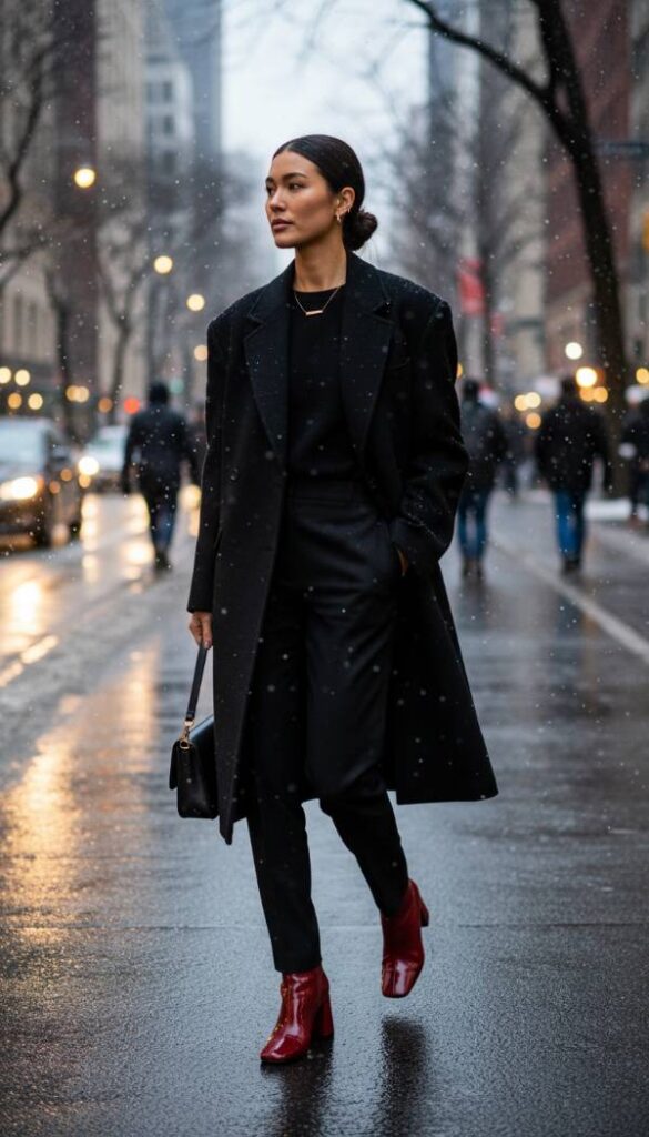 Make a bold declaration with a striking cherry red accent. Start with a sophisticated monochromatic black base: tailored straight leg wool trousers and a sleek, form fitting black knit top. Over this, layer an oversized, dramatically structured wool coat in black, reaching mid calf, providing a powerful silhouette. The focal point of this ensemble is a pair of high gloss cherry red short ankle boots, perhaps with a contemporary square toe and a modest block heel, drawing the eye instantly. These boots infuse vibrant energy into the otherwise restrained palette. Complement the look with a black leather shoulder bag and minimalist silver jewelry for an impeccably chic finish.