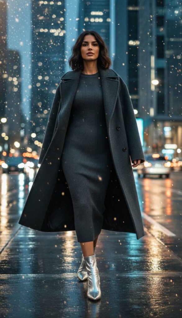 Infuse your winter wardrobe with subtle metallic allure. Opt for a sleek, dark graphite grey knit midi dress, its body hugging silhouette offering a chic foundation. Layer over it an oversized, almost floor sweeping wool coat in a similar deep grey, creating an elongated and dramatic line. The unexpected twist comes with a pair of silver metallic short boots, perhaps with a subtle crinkled finish or a patent sheen, making a futuristic yet elegant statement. These boots add an exciting visual texture and a contemporary edge. Accessorize with delicate silver stacked rings and a structured black mini bag with silver hardware for cohesive appeal.