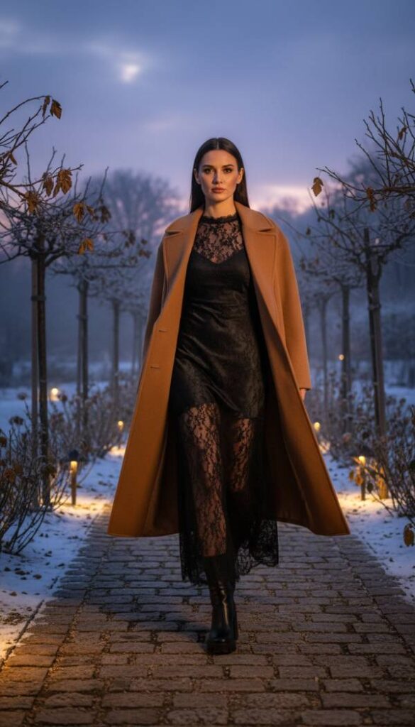 Master the art of ethereal layering with a sheer dress as your foundational piece. A delicate, full length sheer black lace dress, worn over a sleek black slip dress or tailored shorts and a camisole, creates an intriguing play on transparency. Over this, layer a dramatically oversized, structured double breasted wool coat in a dark camel or deep olive, offering warmth and a powerful silhouette. The footwear should be a solid, short boot with a sturdy block heel, perhaps in black or a deep brown leather, providing a grounding element to the airy layers. A wide brimmed hat adds a touch of mysterious elegance.
