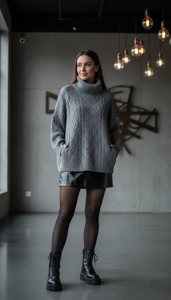 Embrace a playful contrast of proportions with an oversized knit and micro skirt pairing. A voluminous, chunky knit turtleneck sweater in a heather grey, featuring exaggerated sleeves, offers ultimate comfort and a fashion forward silhouette. Balance this with a sleek black leather micro mini skirt, creating a compelling visual tension. For warmth and edge, opaque black tights are essential. Complete the look with a pair of chunky soled black leather short boots, perhaps with buckle details or a platform, grounding the outfit with a contemporary punk inspired vibe. A minimalist silver necklace adds a touch of refinement.
