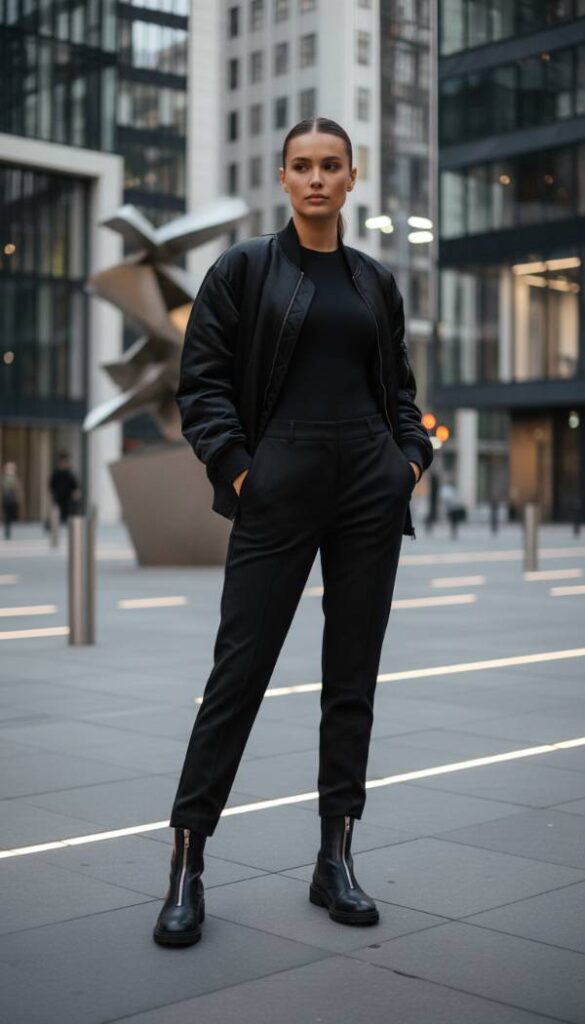 Achieve effortless cool with an elevated sporty chic aesthetic in a sophisticated monochrome. Begin with tailored joggers in a luxurious black technical fabric, featuring a subtle sheen and precise pleating, blurring the line between casual and couture. Pair these with a matching black seamless knit top, offering a streamlined silhouette. Over this, an oversized black bomber jacket, crafted from a premium satin or soft shell material, adds a contemporary edge. The perfect footwear is a sleek, black technical short boot, designed with ergonomic precision and a minimalist aesthetic, perhaps with a slight wedge heel for added height. A black baseball cap and a minimalist backpack complete the look.